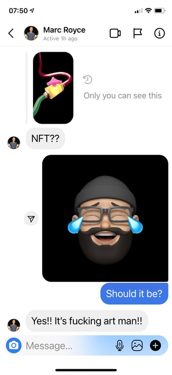 Occasionally, often out of a mix of humble pride mixed with a moment of shrugging-boredom, I’ll “post” something without much thought. And so I posted that image above as an Instagram Story — and, as you can see, Marc assumed quite good-naturedly (and perhaps jokingly) that it was an NFT.
