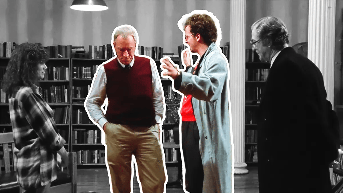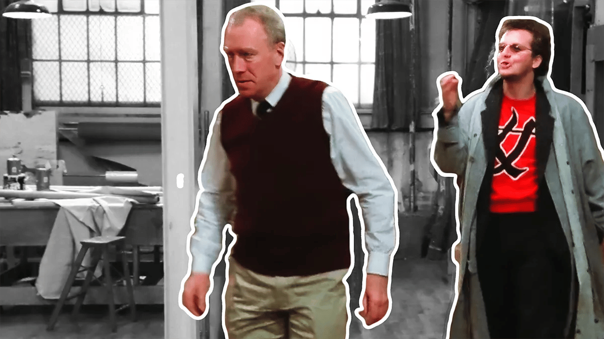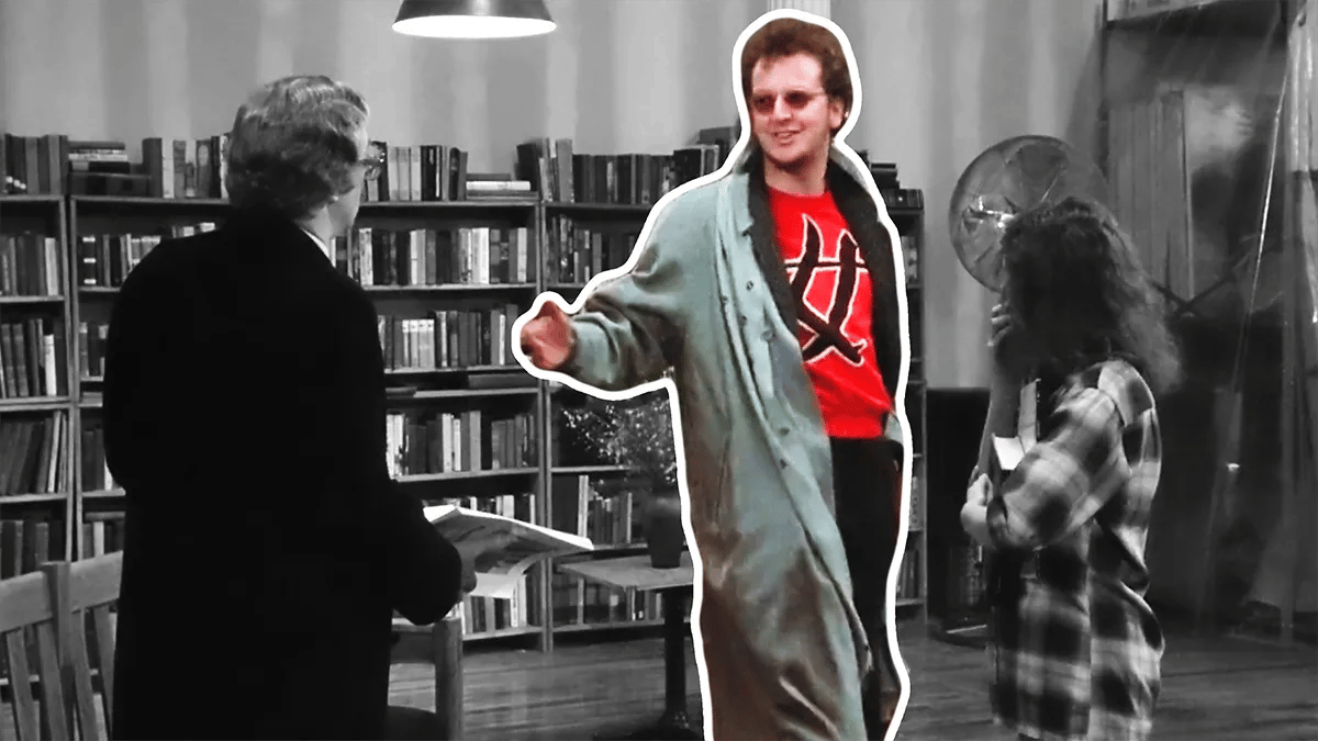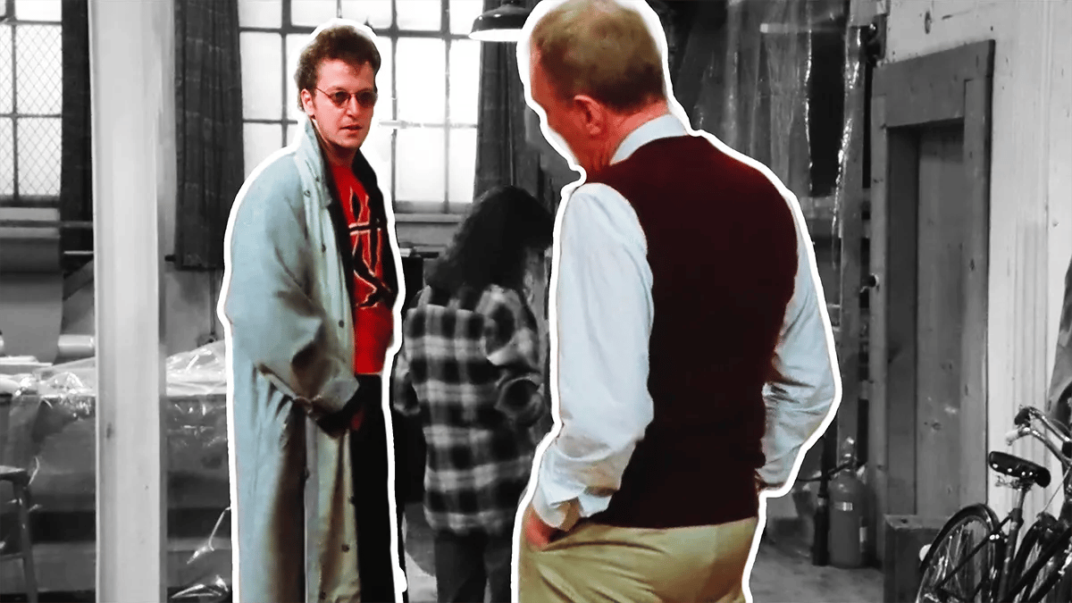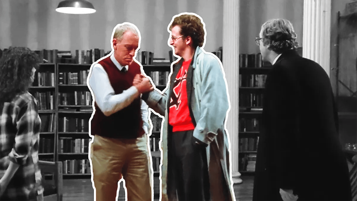 Already we get a sense that these two parties, despite being at the table together, are in conflict. Fredrick, the creative consciousness, cannot even look directly at Dusty, the rational consciousness. Dusty does an awkward hand-shake in attempt at representing that he’s ‘down for the cause’ of art and creativity: just look at the way Dusty is dressed, sporting a streetwear-like designer sweater, popped-collar, hair-styled to reflect a sense of hipness. I’m sure he has red sneakers on, somewhere below the frame.
