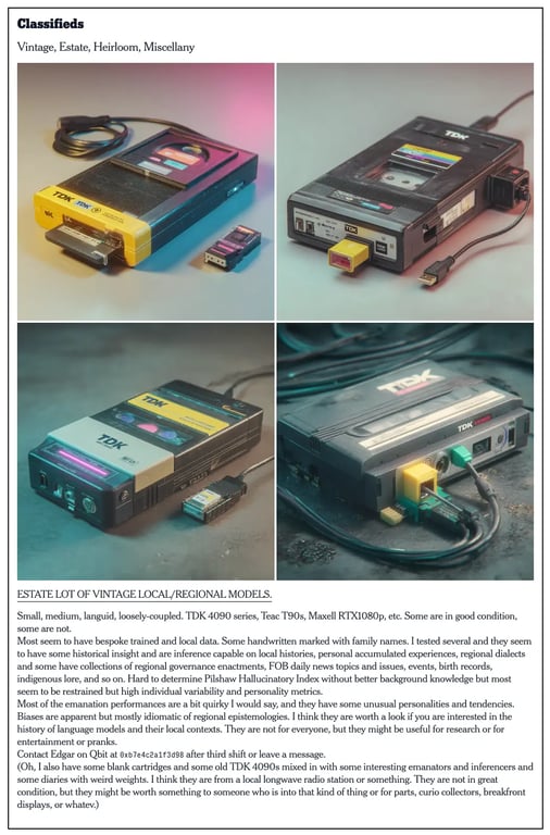 Heirloom Language Models is a speculative design fiction artifact that imagines a future where vintage language models are found at estate sales, auctions, perhaps at flea markets or found while excavating, renovating, in lock boxes drilled out after the owner has died. They may be inscrutible, like knowledge-based time capsules that can emanate and attempt to describe themselves, the contexts from which they derived/came, etc. This assumes that local models — not foundation or corporate models — become a thing, which trends seem to indicate certainly the interest and definitely the technical possibility. One can imagine the tools and resources necessary to train a model could diminish over time making it possible to 'train' at home. There would be a world of models with unique regional data and personalities. The implications in this speculative fictional artifact — a classified advertisement — are meant as a wink of a consideration of how local knowledge might be contained in such artifacts. Imagining a world in which there are not canonical models or models who might contain the biases of the models' owners/operators — but more local sensitivities. A cacocphany of models and their emanations...
