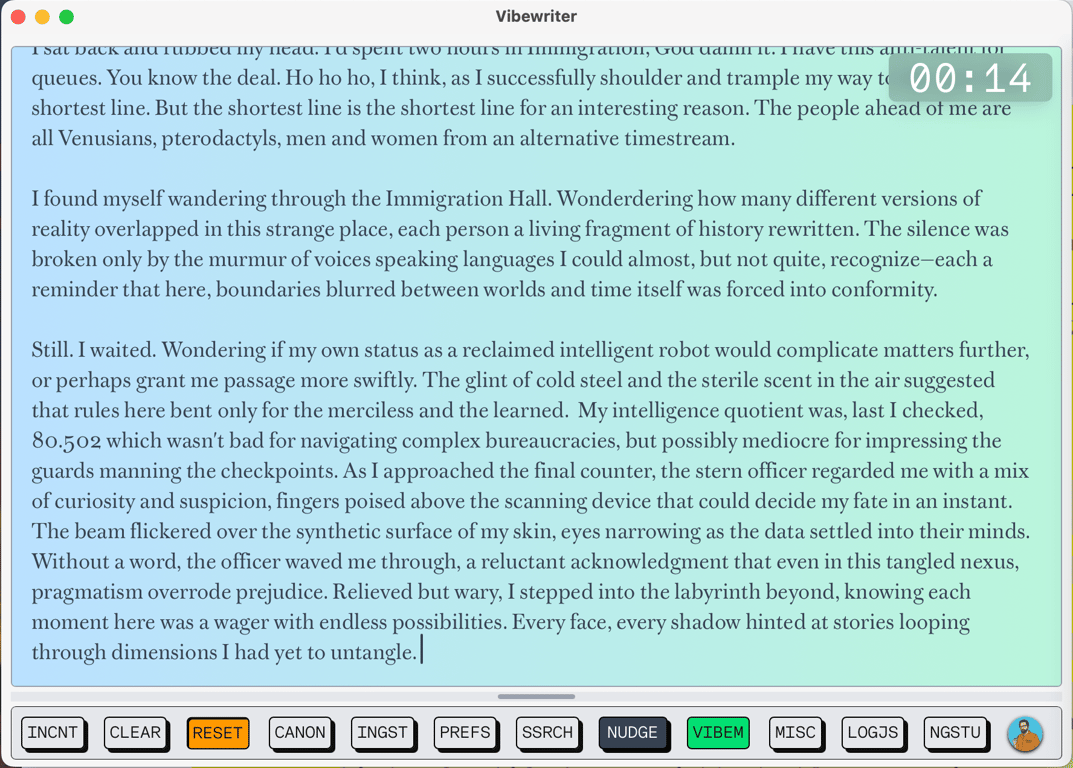 Similar to how Vibecoding seems based on intuition, feeling, and rhythm, I've been exploring how to make writing more of a "vibe move" with gamified elements.